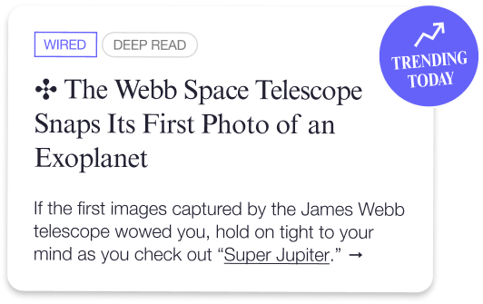 Subscribers receive a selection of fascinating pieces from reputable publishers every morning. In each edition, you’ll find articles everyone’s talking about — and articles everyone will be talking about. No visiting countless websites. No scrolling through social media feeds. No searching whatsoever. Recommended Reads brings them all to you.